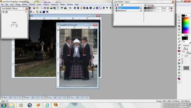 Copié la imagen y pegar como una nueva capa y utilizan entonces imagen > espejo para cambiar la orientación. Luego disminución de la transparencia en la capa superior reflejada por lo que podría alinear la cabeza del hombre que quería seguir con el sombrero usado por el hombre en la capa más baja. Entonces era sólo un caso de borrado de los bits que no quería.