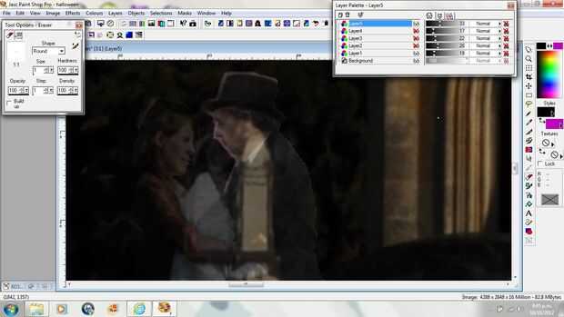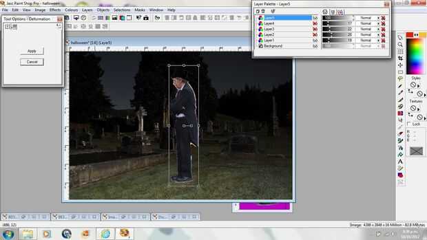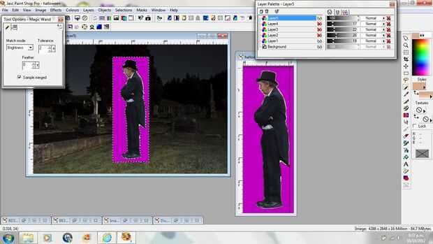 La imagen del hombre fue copiada, pegado en el fondo un disparo, se utilizó la varita mágica para seleccionar la púrpura y trataba de quitar Editar > cortar en el menú de selección > seleccionar ninguno y luego transformación herramienta fue utilizada para cambiar el tamaño de lo.