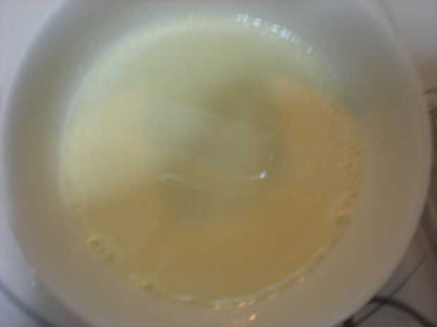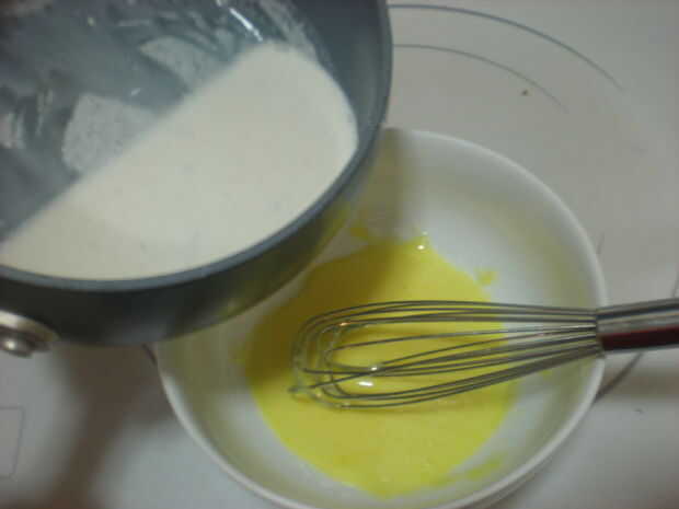Este paso es muy importante, después de 15 minutos, destapar la cacerola con la mezcla de crema. Vierta lentamente la crema en la yema de huevo con una mano mientras utiliza un batidor en remover como se muestra en el cuadro #1. Una vez mezclado debe mirar como o similares a la foto #2.