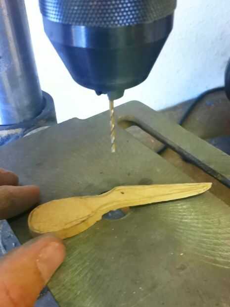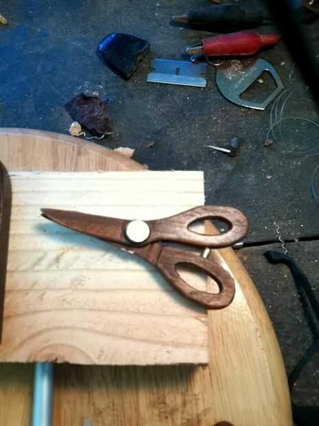 Mida y perfore los agujeros para el tornillo central. Luego marque y en una sierra caladora cortar los lazos del dedo de las tijeras.