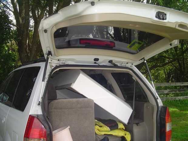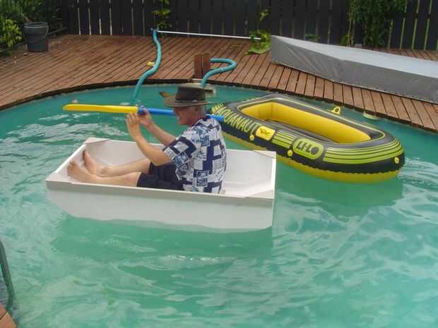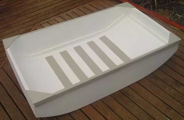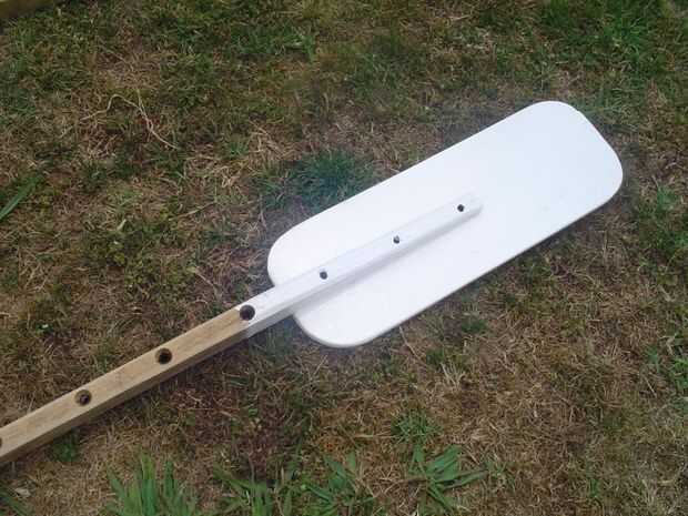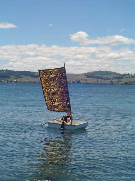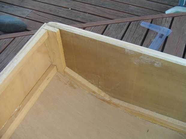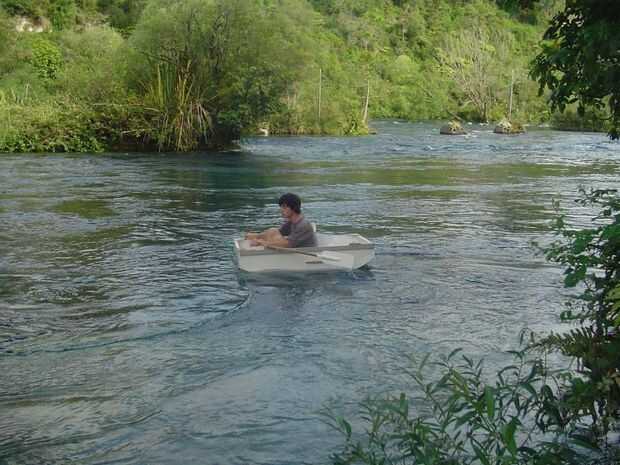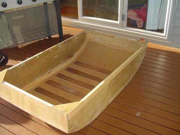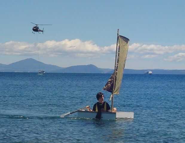 El barco (llamado Appie ) fue hecho de sobras de madera contrachapada y madera de la plataforma. La parte inferior es de 3,5 mm capas, la capa de 7mm de lados. Pegamento del poliuretano y pintura de látex casa fueron utilizados. Después de 3 meses uno de las costuras abierto. Esto fue sellado con pegamento de la construcción, seguido por una tira de hoja de cama de la pintura sobre el lomo. Costo total hasta la fecha ha sido algo así como 20 dólares (NZ) de pegamento y algunos bits y piezas.