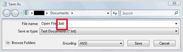 Haga clic en guardar como en la pantalla y borrar el txt y poner .bat y guardarlo como lo que quieras. Originalmente salvarlo como Fie abrir, luego lo cambié me atrevo abrir esto. Ah y guardalo en el escritorio.
