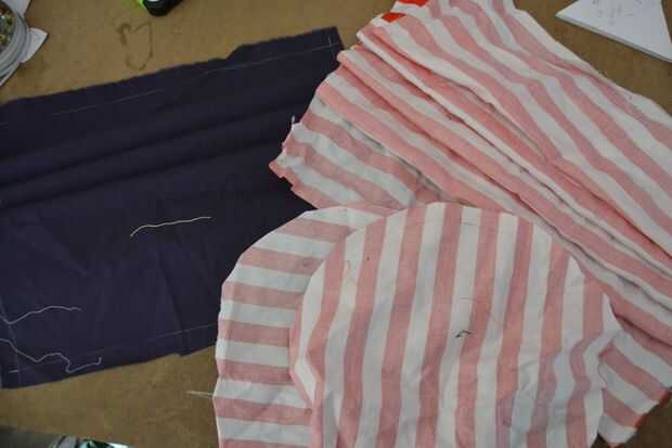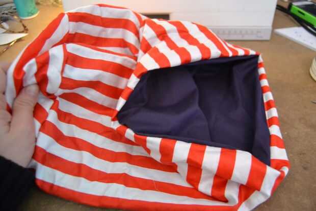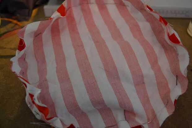 puede hacer el bolso de dos telas diferentes como yo lo hice, o utilizar a una sola tela. será reversible, por lo que es bueno usar dos unos distintos. Utilicé un rojo y blanco a rayas de uno para un lado y uno violeta oscuro liso por el otro, aunque he utilizado a la tela de rayas para la parte inferior circular interior y exterior.