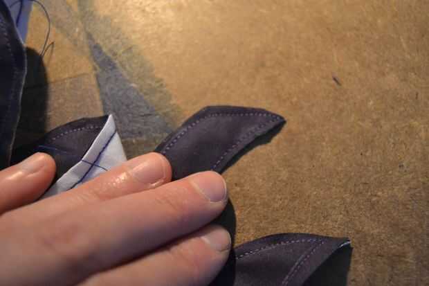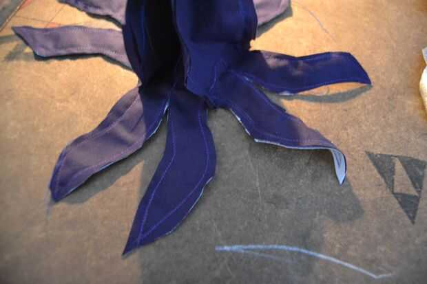 Ahora poner la parte del cuerpo en la parte de tentáculo (lado derecho del lado derecho) y coserlas juntas, esto funciona mejor si trabaja en pasos (pin y coser 2 tentáculos, entonces los 2 siguiente). Cuando todos los tentáculos se suturan recortar el margen de costura en todas las costuras (excepto cuando la abertura en la parte del cuerpo) muy cerca de la costura. en las puntas de los tentáculos tiene a caut a casi todo el margen de costura (ver foto).