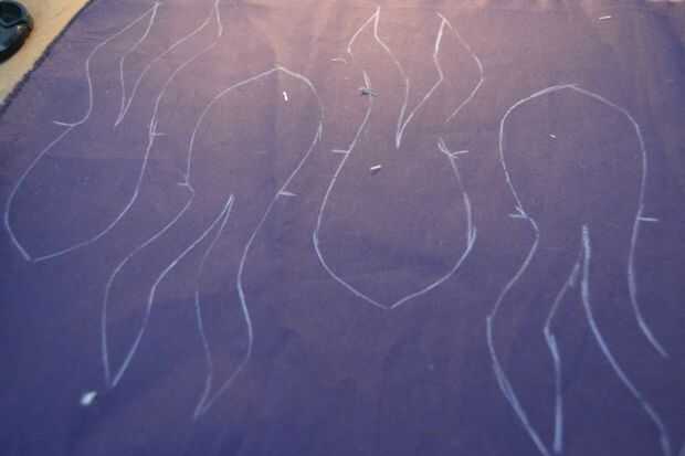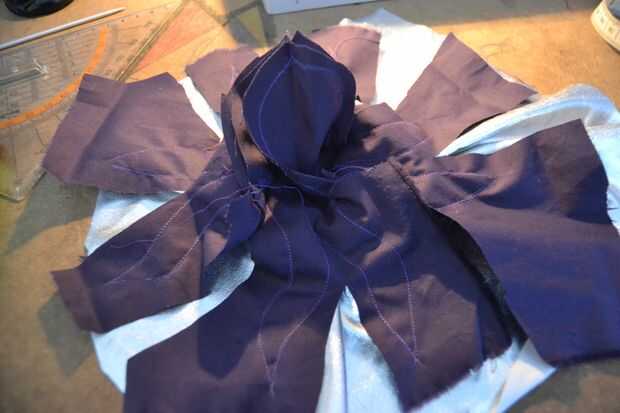 para el pulpo, elegí una tela violeta de cuerpo y una astilla uno para la parte inferior. se necesitan 4 veces el cuerpo y parte de un tentáculo, pero tenga en cuenta que el patrón de tentáculo es sólo una cuarta parte de eso, tienes que repetirlo cuatro veces al lado del otro para formar una parte circular grande (ver imagen). Añadir el margen de costura en todas las partes.