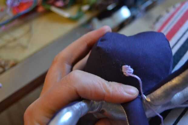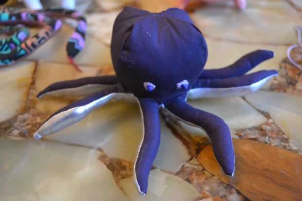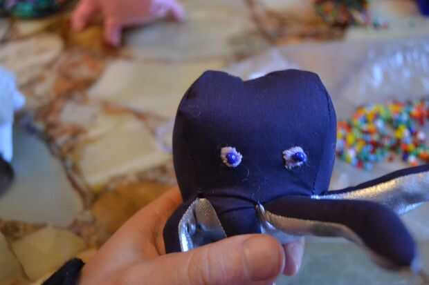 casi terminado ahora, todo lo necesita es una cara. con hilo de bordar violeta cosía a contornos de ojos más grandes a uno de los lados del pulpo y de había rematado con perlas azules como pupilas.