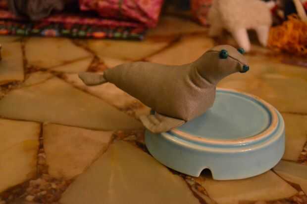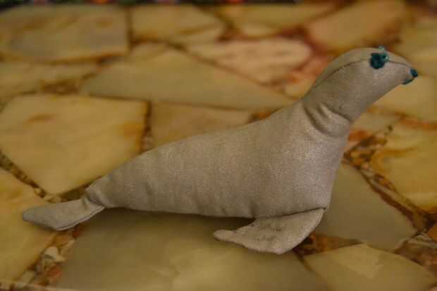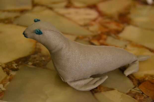 usé a una tela de color gris plata para el sello entero y el hilo de bordar color esmeralda para los ojos y hocico y perlas verdes para los ojos.