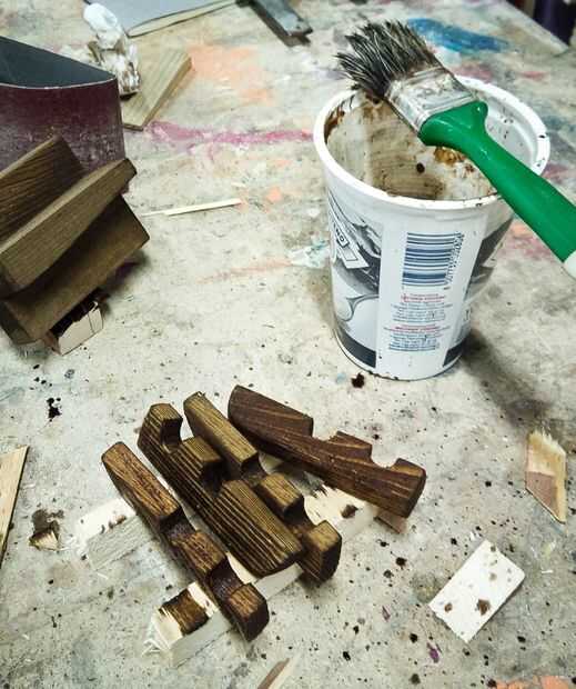 También puede pintar piezas con un agente impregnante marrón, mordiente, para hacer un aspecto uniforme en todas las superficies.