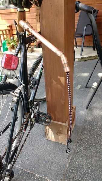 Él es un perro bien entrenado y en un paseo y rara vez camina adelante o pernos delante de mí, sobre todo si lleva una 'Halti'. El halti, combinado con una correa floja colgando, hace ejercicio controlado y agradable para ambos. Me decidí a diseñar un caminante de la bicicleta que le gire libremente desde donde se une a la tija de sillín, sin embargo, cuando hace pivotar adelante chocar contra mi pierna derecha, manteniéndola así mueva más allá de mi cuerpo y tener el perro al lado de la moto y unas pocas pulgadas detrás de mí. Esto lo mantiene seguro al impedirle moverse delante de mí o de la moto y lejos de los pedales y las ruedas. Usando una cuerda del amortiguador auxiliar con suficiente holgura, cuelga de su cuello al igual que cuando caminamos y también tiene suficiente resorte en el elástico para evitar cualquier tirón mueve de un tirón en la bicicleta. Además mi diseño permite el retiro rápido del caminante por simplemente tirando del pasador de horquilla.