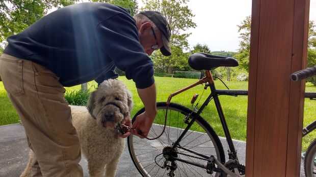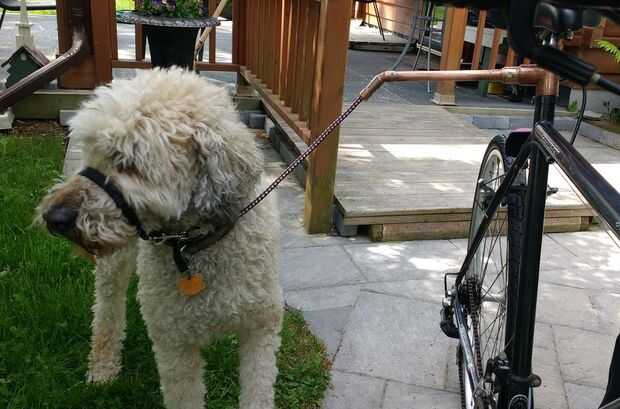En segundo lugar, deben ser perros... perros hacer sus negocios y olfatear e investigar. Asegúrese de que ha tenido la oportunidad de ir, se olió los pastos y arbustos y ha tenido un buen trago. Paseo de sólo 5 a 10 minutos. Desmontar y darle un descanso. Nuestro Woodle le gusta bici a pie durante aproximadamente 20 minutos con un descanso en el medio.