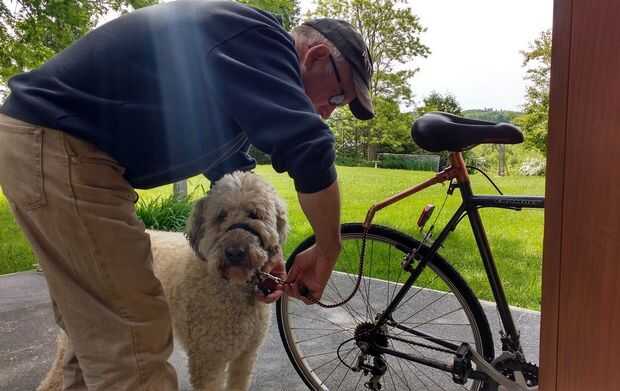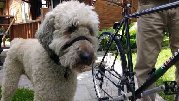 Fije el clip del perro al final de la cuerda del amortiguador auxiliar al clip halti de su perro. Asegúrese de que haya suficiente longitud y holgura para su perro al mover la cabeza libremente sin contacto con el andador o la bicicleta. Puede que necesite utilizar un cable de bungee más si tu perro es más pequeño.