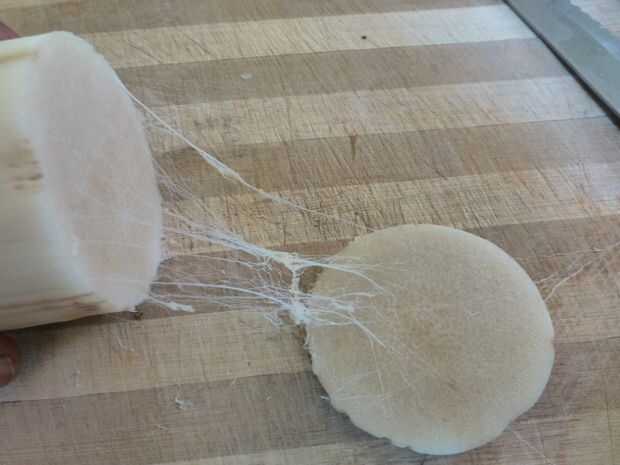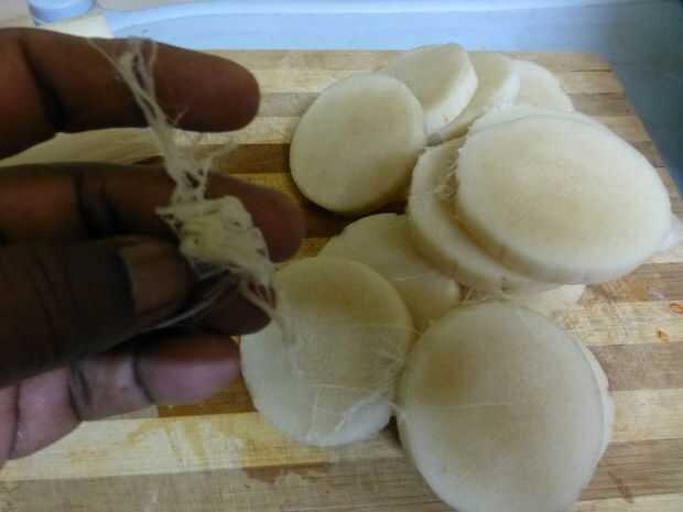 Hacer 1/4 de pulgada de espesor alrededor de segmentos de tallo. Puede encontrar gran cantidad de fibra al cortar el tallo. quitar la fibra con los dedos y desechar