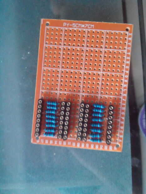 A continuación inserte 8 resistencias justo al lado de la cabecera (si se utiliza un espaciamiento de 4 agujeros por resistencia cabrá en estándar perfboards pequeña como la mía) y soldarlos en el lugar, asegurándose de hacer un puente de soldadura entre las resistencias y la cabecera (me gusta todo en su lugar soldar primero y hacer el puente después). No es un método bonito y en su lugar puede utilizar los cables de las resistencias como puentes, pero los puentes están un poco más fácil y más rápido.