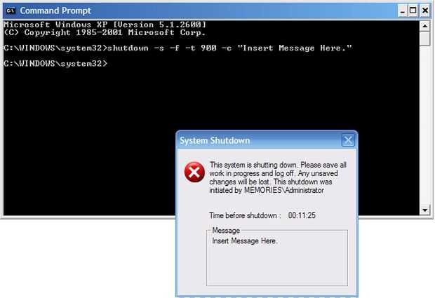 SHUTDOWN -S -F -T 900 -C "Insert Message Here."