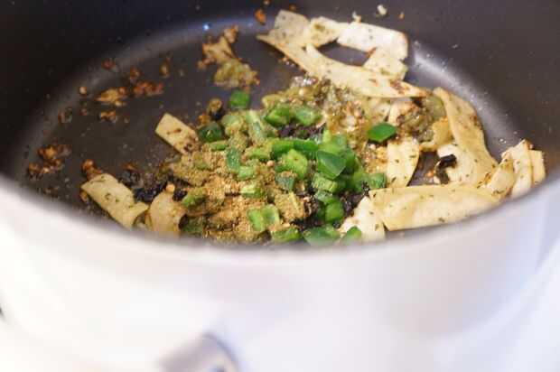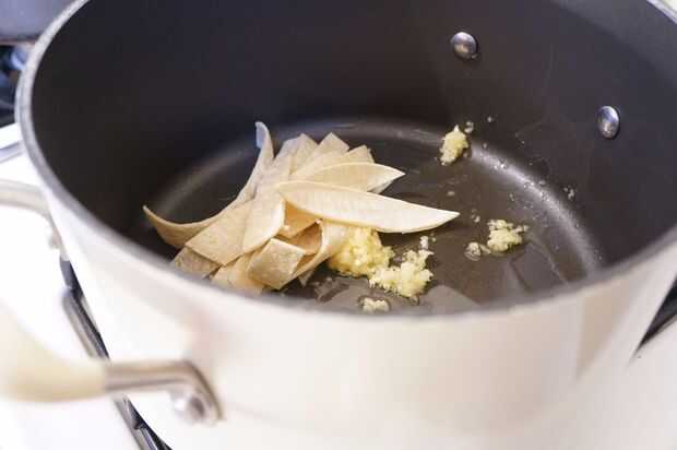 Cuando la sartén está caliente muy caliente agrega las tiras de tortilla y sofría hasta que las tiras comienzan a crujiente para arriba y el ajo comience a dorar ligeramente (unos 5 minutos).