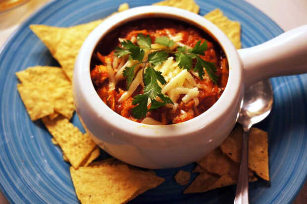 Añadir el queso cheddar, cilantro, trozos de tocino, chips de tortilla y especias y pimiento si no lo has hecho ya. No necesita mucha pimienta chiptole dar el tazón de fuente ese agradable sabor ahumado caliente picante.