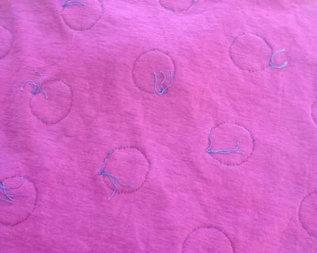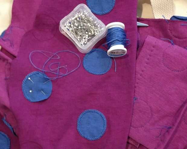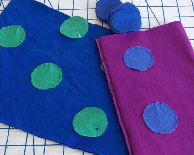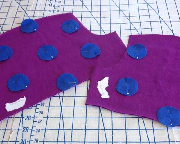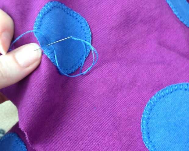 Para este proyecto, solía seda del bordado y una puntada de manta los lunares se aplican dos capas de algodón. Al principio traté de fijar e Hilvanar los puntos en lugar de cada sección de tela, pero los bordes comenzó a rizar como tejidos de punto como hacer. Al final, funcionó mejor a aplicarlos uno a la vez con alfileres.