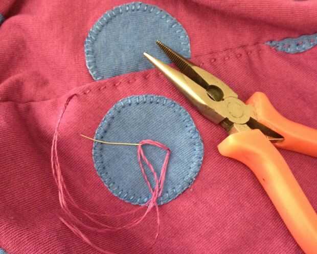 Múltiples capas de jersey de algodón de coser a mano a veces puede ser difícil, especialmente en la línea de costura. Un par de pinzas de joyería puede ser útil para ayudar a tirar de la aguja a través de una situación difícil.