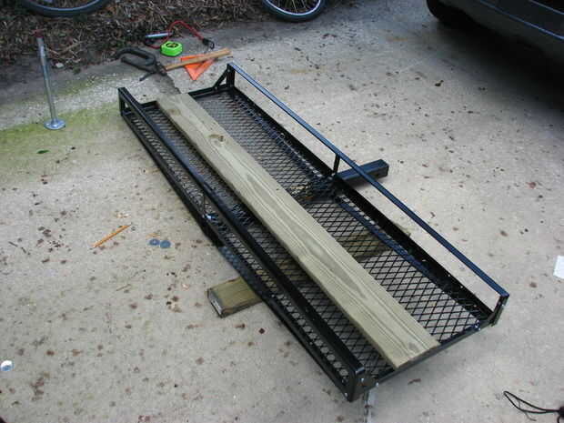 Haga dos agujeros en cada extremo de la tabla y dos en el centro del tablero. Perforaciones correspondientes en cualquiera de los extremos del transportador de carga y a través de la barra de enganche de 2".