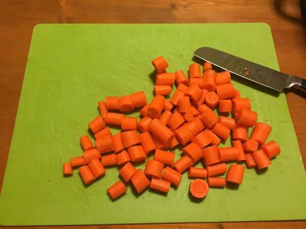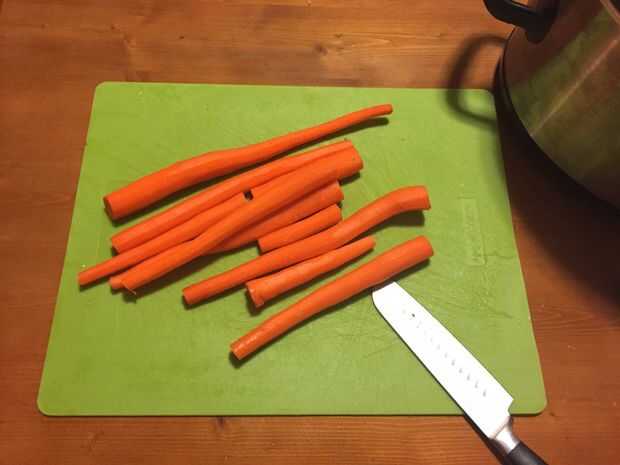 Pelar y cortar los extremos de las zanahorias y picar en trozos pequeños. Pila encima de carne. Si usa zanahorias puede la bolsa en la descarga o cortarlas por la mitad. Su elección del tamaño de la zanahoria que desee en cada bocado.