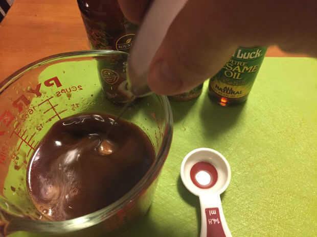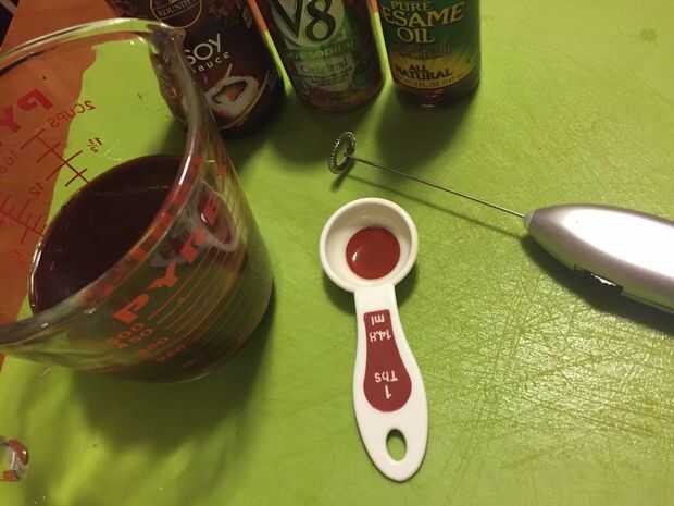 En un tazón pequeño bate jugo de tomate, salsa de soja, azúcar y aceite de sésamo.
