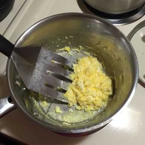 Añadir el aceite a la olla y volver a fuego medio. Después se calienta el aceite, agregar los huevos y revueltos.