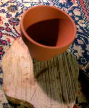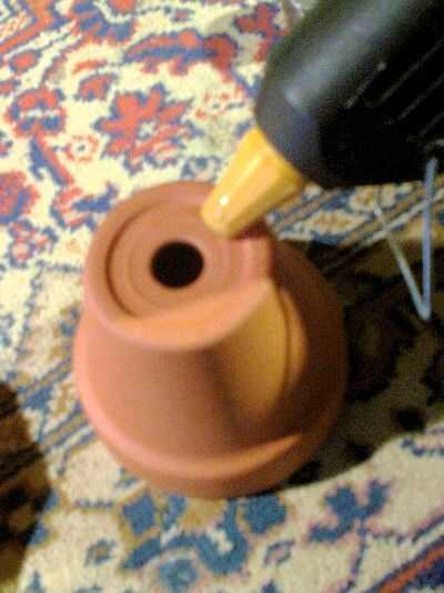 Poner el cable con la clavija (que originalmente fue conectada en los dos pernos en la placa base) en el agujero y fijarlo con una pistola de pegamento. Coger la maceta (debe haber un orificio en su parte inferior, si no, deben perforarlo) y arreglarlo, arreglar los agujeros de centro en uno al otro en el bloque, para que pueda obtener una simple maceta en una parte inferior, con un agujero coaxial.
