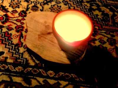 Ahora con cuidado quite la pequeña pieza de plástico de la bombilla de Navidad a los dos electrodos desnudos de ella - estas serán conectadas en el enchufe de placa pegado. Conéctelas firmemente y por último, conecte el adaptador (I cortar el enchufe y soldar los cables y al final pega las conexiones en la parte trasera de la culata madera rebanada).