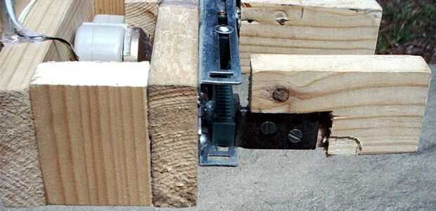 Si te fijas en las fotos usted verá dos L en forma de soportes. Se trata de 1 7/16" de 1 7/16" con un extremo en la forma de encajar el engranaje de estante. Éstos fueron hechos de un somier viejo. ¿Qué puede encontrar que funcione? Estos fueron cortados usando una sierra con disco utilizado para corte de metal de un corte. No hay herramientas de lujo fueron utilizadas en la fabricación de este robot.