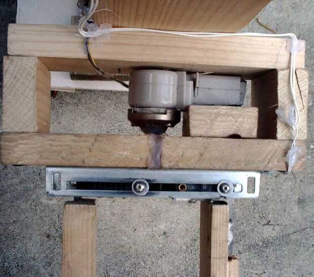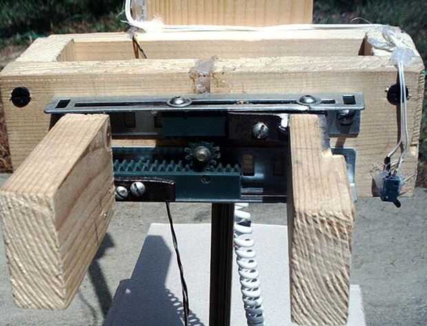 Coloque el engranaje sobre el tornillo. Se trata de un ajuste muy apretado. Usé un alicates de bloqueo de canal para sostener el engranaje gira el tornillo. Gire el engranaje sobre el tornillo hasta que el equipo incluso donde el engranaje de estante es con la tapa cerca de la de base pero no vinculante para él. Cuando todo se ve bien cortado de lo que no es necesario el tornillo #8-32. Poner pegamento en la cabeza del tornillo que se encuentra dentro de la tapa y deje secar. Poner pegamento en la tuerca y alrededor de la base de la marcha. Cuando está todo tornillo seco la tapa detrás del motor. Lado el montaje del engranaje del motor a través de la raja hasta el agujero. Utilizando un sello de la pistola de pegamento caliente la raja. Vuelva a colocar el conjunto del riel.