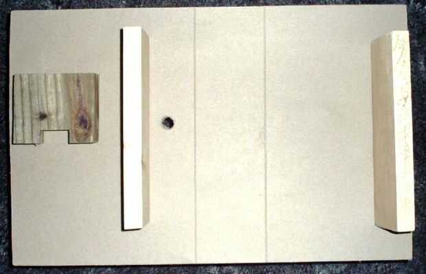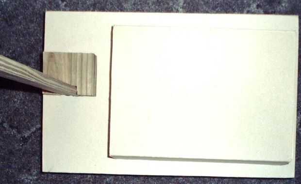 Corte 2 piezas de 3/4" espesor madera 8 3/16" de 3 2/16". Vamos a utilizar esta madera como las 2 paredes a la caja que estamos construyendo en la parte superior de la base principal. Coloque y pegue una pieza en medio de la base, 14/16 de pulgada de la parte posterior de la base. La 2 º pieza va 10 2/16" de la pieza 1. Esto va a formar la caja que es 10 2/16" largo en el interior. Cuando el pegamento esté seco, clavo los 2 trozos de madera en lugar de la parte inferior de la base con "clavos del Panel del". Me gustaria perforar un pequeño piloto para el clavo 1.