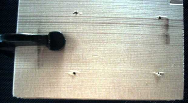 Retire el riel y retire los cuatro clavos de la madera. Usando los agujeros de clavo como un guía Perfore cuatro agujeros en la madera. Tomar la 2 º pieza de madera que corte y pinza sobre la pieza 1. Ahora perfore cuatro orificios a través de la 2da pieza de madera también.
