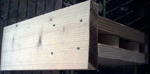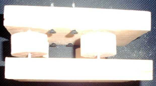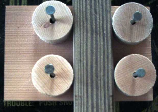 Cortar dos 3/4 trozos gruesos de madera 3 1/2" de 5 7/16". Coloque un rodillo en la parte superior trasera de la madera pero no deje que el rodillo ir pasar el borde de la madera. Martillo el clavo en el centro del rodillo pero no demasiado porque usted va ser tirando de los mismos más adelante. Coloque el travesaño en la madera, asegúrese de que el riel esté recta y firmemente contra el rodillo 1 (ver foto). Coloque el resto de los rodillos ajustada contra el carril y clavo en su lugar.