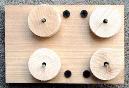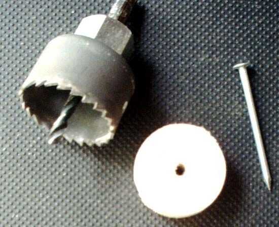 Usando una hoja de agujero de círculo de 1 1/2" corte un orificio en un 3/4" pieza gruesa de madera. Sacar la madera (ver foto) de la hoja. Esto se utilizará como un rodillo. Hacer cuatro de estos rodillos. Un clavo "5D 2 pulgadas común" se convertirá en el eje del rodillo.