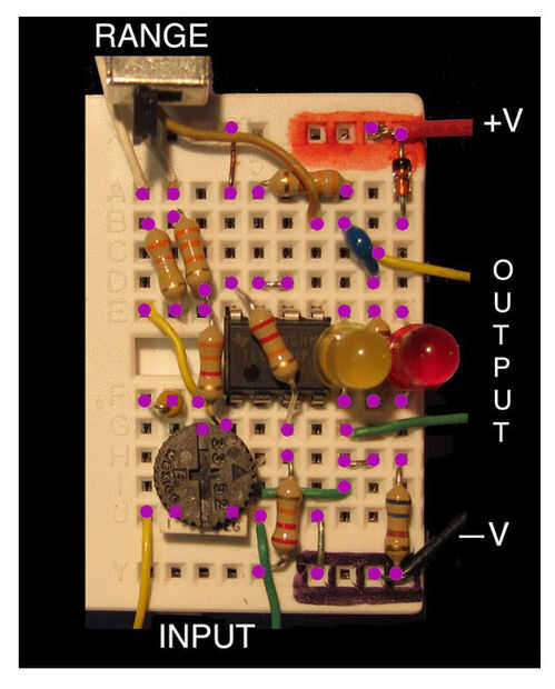 3. el LED bipolar está encendido. Seguramente algo anda mal. Compruebe que el voltaje en "común" está a medio camino entre la batería más y menos.