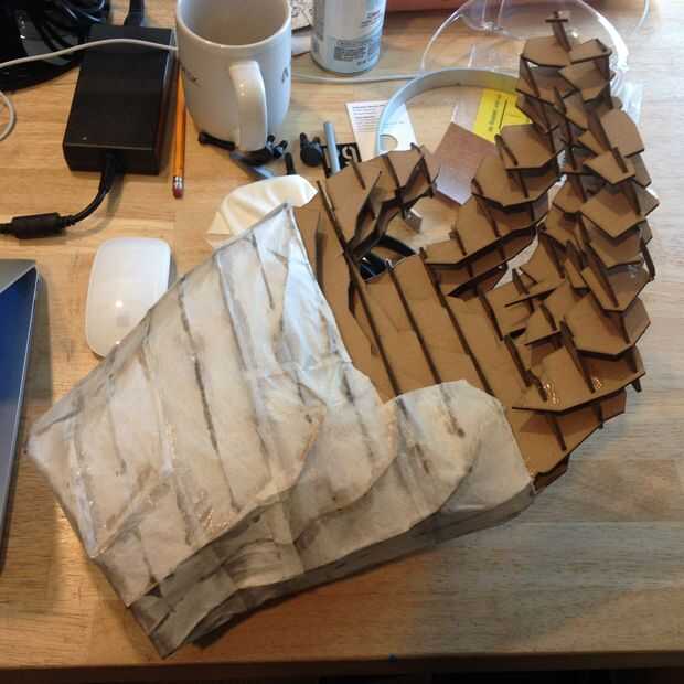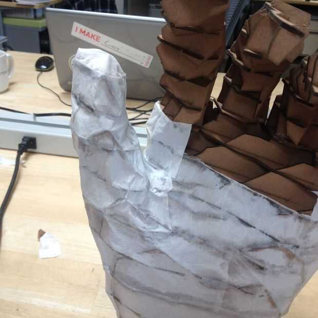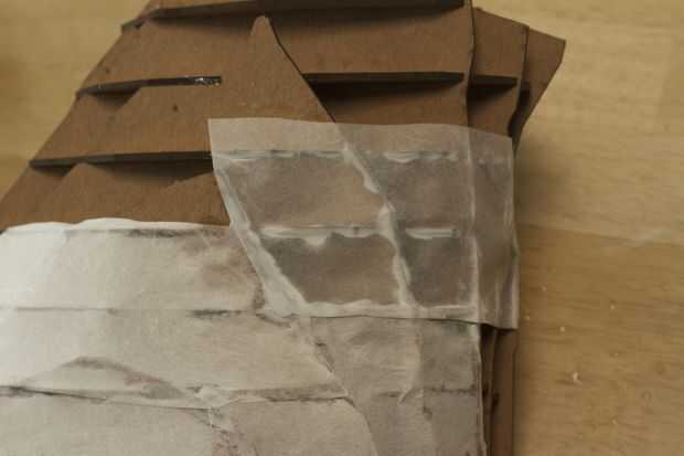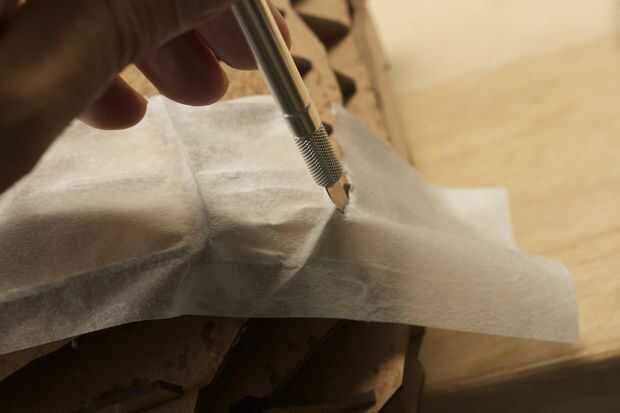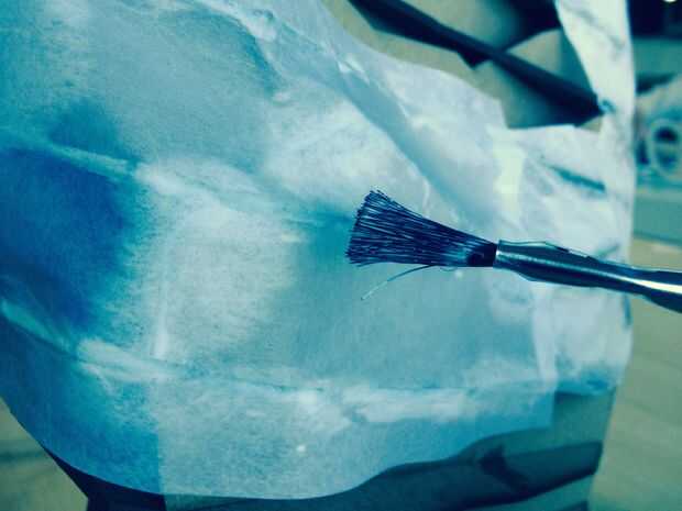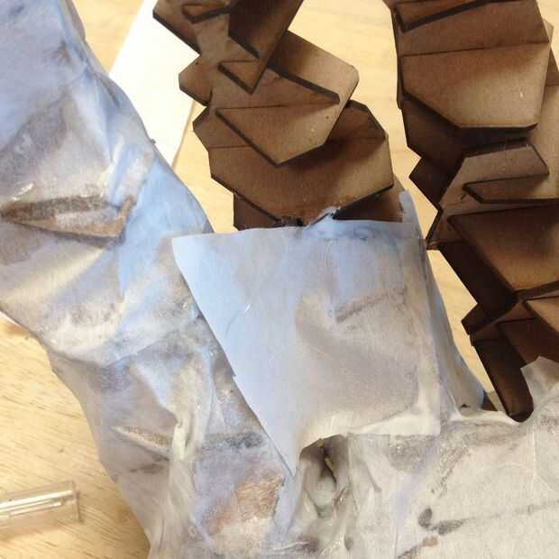 2) use el pequeño cepillo de 1/4 de pulgada para el pegamento PVA se aplican a los bordes de la escultura, este cepillado solamente sobre el área para un determinado trozo de papel que ya ha sido cortado. Ser generoso con el pegamento que quieras sumergirlo a través del papel donde se encuentra con la superficie de la estructura del 123D.
