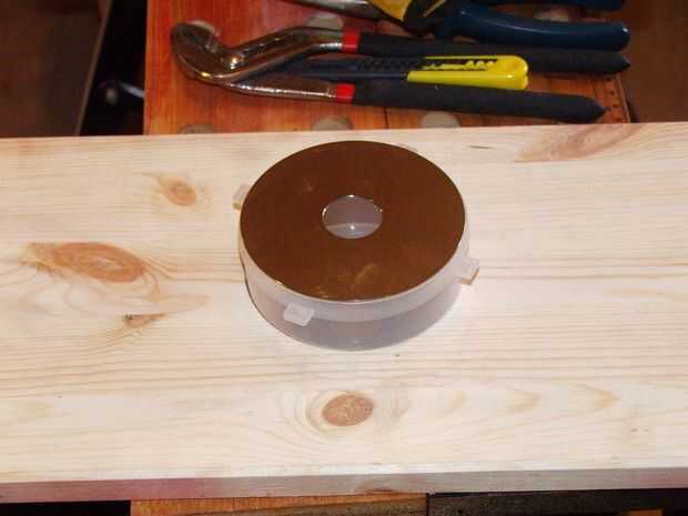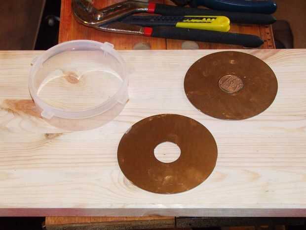 Tuve la suerte cuando compras materiales. El envase de alimento plástico redondo era exactamente el mismo diámetro que los platos del disco duro 3 1/2". Estos tres forman las partes principales del cilindro difusor.