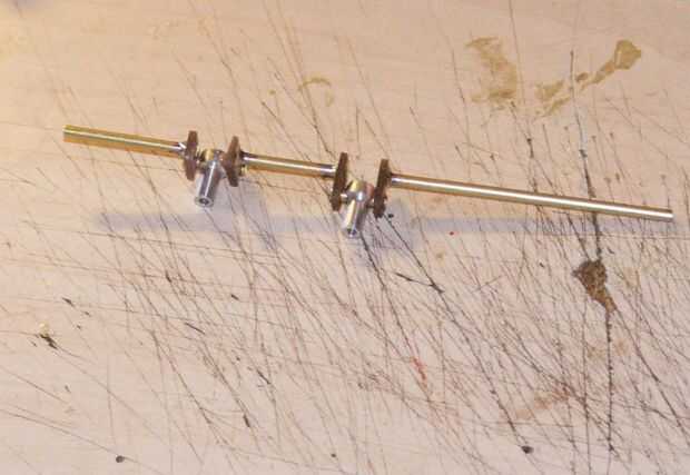 Si tienes acceso a un torno pequeño, una mejor solución sería utilizar alguna acción de barra de latón de 10mm. Entonces podría centro taladro para el eje principal y de taladro de centro para el trazo. A continuación, parte de 4 discos individuales, asegurando así que todos los vástagos son idénticos y dando algún contrapeso en el cigüeñal.