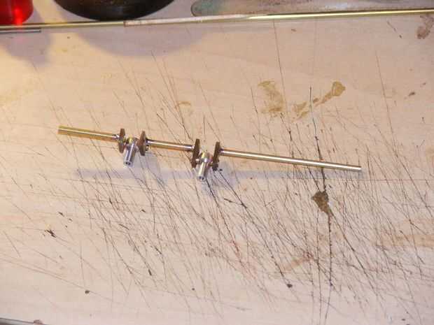El eje principal es un pedazo de tubo de cobre de 2,5 mm. Si tuviera acceso a la barra común habría y rodamientos de punto de aguja, pero no.