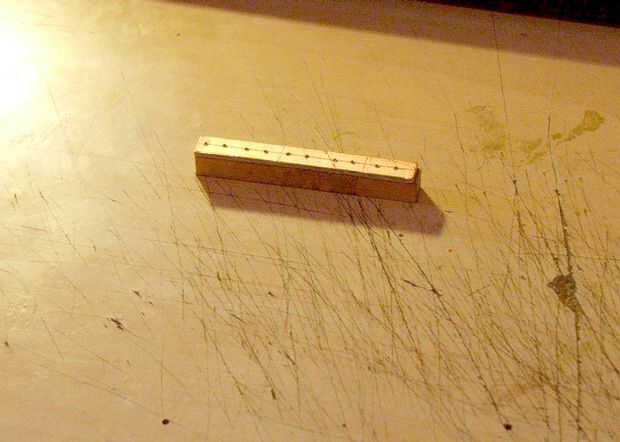 Empecé marcando y centro de la perforación de la placa de PCB cobre. Cortarla en una sola tira con la Dremel. Luego fue unida a un trozo de madera con cinta de doble cara para ayudar a mantener constante. Luego perforé todos los orificios de 5mm entre centros. Esto le dará un golpe de 10mm.