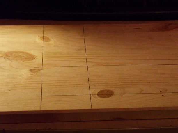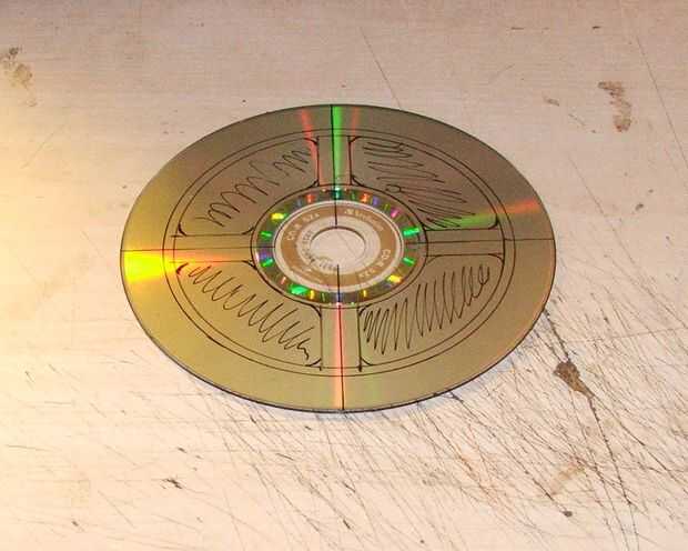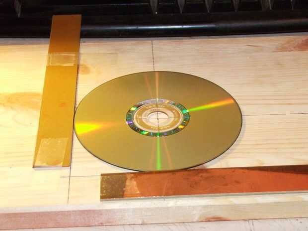 He utilizado un proceso similar a los platos del disco duro. Compone una plantilla simple usando un trozo de madera plana buena. Los discos son exactamente de 120mm de diámetro, por lo que dos líneas paralelas de 60 mm., con dos ángulos rectos fueron cuidadosamente marcadas en la madera. Luego fueron grabados dos conocidos cantos rectos a las líneas. Ahora cuando un disco es empujado contra ambos bordes de las líneas deben biseca y marque el centro. Entonces era simplemente una cuestión de utilizar brújulas estándar para marcar los anillos y un borde recto para marcar los rayos.