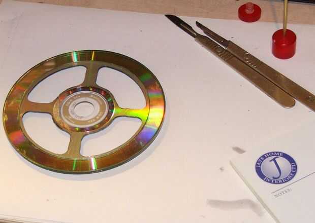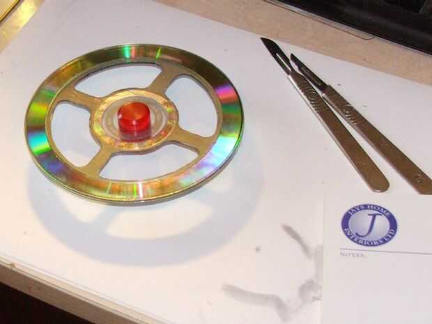 Con el taladro en su ' máxima velocidad, puse un cortador de alta velocidad Dremel en el portabrocas. El cortador se alimentaba a través del CD y luego el disco fue dado vuelta a mano asegurando un corte circular perfecto. Salí poco 'fichas' de material en cada corte para parar los pedacitos de volando. Estas fichas se cortaron con un cuchillo y arregladas para arriba con la Dremel.