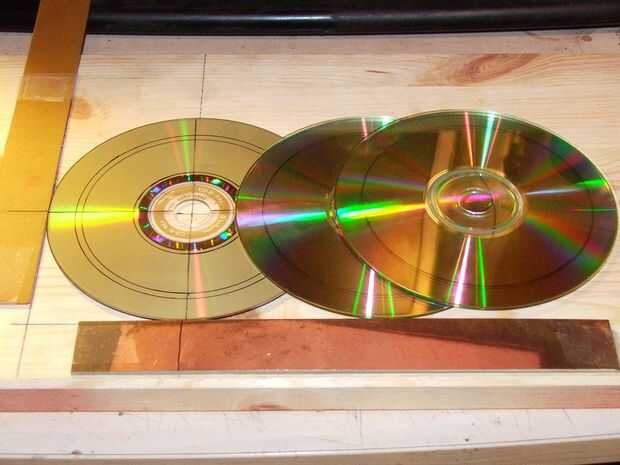 Decidí probar y hacer un volante de CD de 3 discos. El disco principal sería llevar al jefe y tienen radios para aligerar su centro. Los otros dos discos se reduciría a dos anillos de 12mm de ancho. Cuando pegado a los bordes exteriores del disco principal esto debe dar un volante decente. Sin embargo, como cortar los CDs con precisión sin acceso a un router CNC iba a ser interesante. También les marca hasta cuando tienen un agujero en el centro iba a ser un desafío.