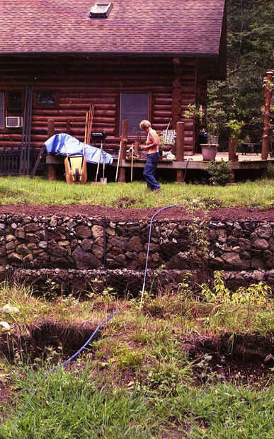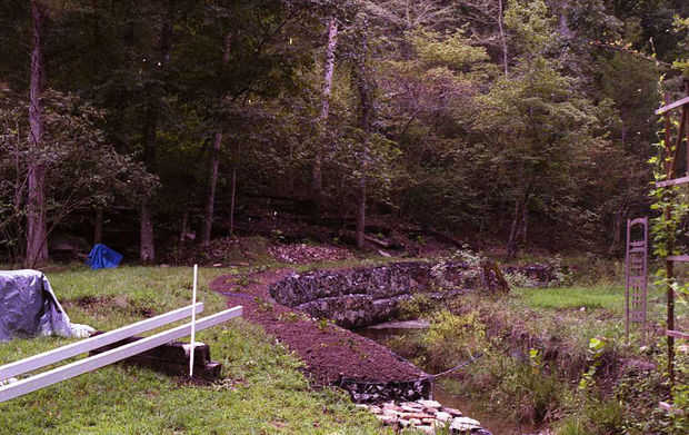 El puente tuvo que ser lo suficientemente largos para abarcar la secuencia. En el lado más cercano a la cabina, había por lo menos 3 pies adoptado por la anchura de los gaviones y luego todavía más lejos detrás para cavar cimientos sólidos. En el lado lejano, había grava suelta que teníamos para conseguir lejos de para encontrar sólido del cojinete. La distancia mínima de luz que podría atravesar el arroyo y sentarse en superficies de contacto sólidas fue 24 pies. Y el tractor de jardín John Deere tuvo que conseguir en y fuera del puente de nueva construcción. Nos puso en el área de una superficie de 5 pies de ancho.