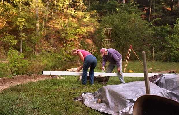 Usé el nivel 'rechoncho' de un contratista para obtener las alturas de la plataforma existente y las elevaciones del terreno en [1] la cubierta, [2] el lado cercano de la orilla de la corriente, [3] al otro lado de la orilla del arroyo y varios puntos entre la cubierta y el Banco. La línea de congelamiento (profundidad posible de formación de hielo bajo la superficie de la tierra) en el norte de Arkansas Ozarks es cerca de 18 pulgadas. Tenía la intención de verter Plaza de 18 pulgadas por 6 pulgadas de pies de página concreto grueso bajo las columnas de soporte para difundir la muertos carga (peso de la estructura) y la 'sobrecarga' (cualquier cosa que podría poner en la estructura como el tractor de césped, personas, muebles y similares). Así que la parte inferior de los agujeros de los pilares de hormigón fueron 24 pulgadas (18 en la línea de congelamiento) y un extra 6 para el pie de página como medida de seguridad debajo de la superficie de la planta. Con la profundidad por debajo de la tierra y la altura necesaria por encima del suelo, pude calcular la altura total de cada columna... y la cantidad necesaria de forma material, concreto y refuerzo necesario.