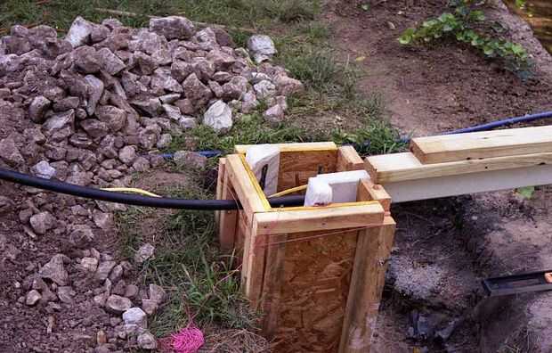 Ahora viene el "más en eso más tarde" parte. Mac y Geri y decidido a "hundirse" el canal de acero y la madera tratada en las columnas de hormigón. Esto impediría cualquier torsión del material. Sin embargo, también significó que algunas columnas tendría sólo dos 2 X 10 maderas incrustadas en el hormigón y algunos 2 X 10s y acero. Para hacerlo un poco más complicado, Mac decidió que sería bueno si pudiéramos utilizar uno de los canales de acero hueco para llevar una línea de agua y una línea eléctrica al otro lado de la corriente. Insertos, dos-por secciones envueltas en bolsas de plástico, tenía a sujeta dentro de las formas básicas para prever estas intrusiones.