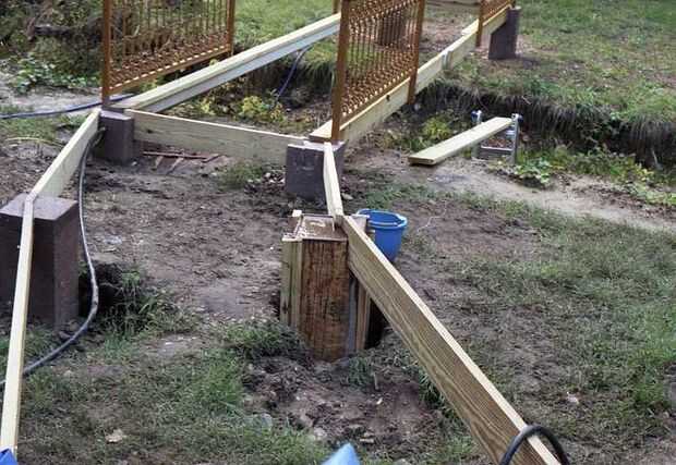 Cuando las vigas exteriores estaban en su lugar, los miembros cruzados se cortaron y se clavó para apoyar el centro piezas de vigueta que funcionan la longitud entera de la tarima.