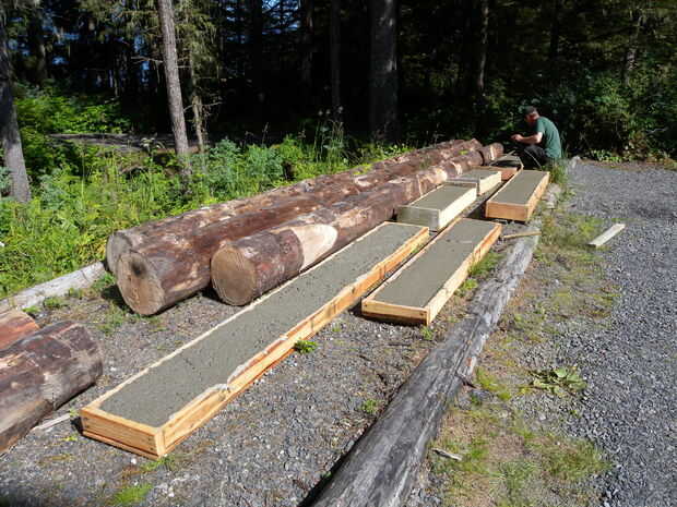 Los pernos fueron fijados en las formas junto con barras de refuerzo y todo atado con alambre. Formas golpeadas con un martillo y pinchadas bien con varilla de repuesto para bolsas de aire mínimo.