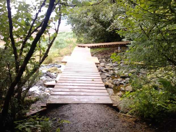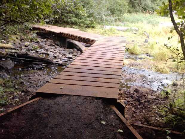 Utilizando mano de obra y las carretillas de grava estaba llena en el sitio y relleno fue vertido y compactado. Sills se hicieron con tableros de cubierta de sobra para ayudar a mantener la grava donde sea necesario y a dar pasos para llegar hacia arriba y hacia abajo en los estribos del puente.