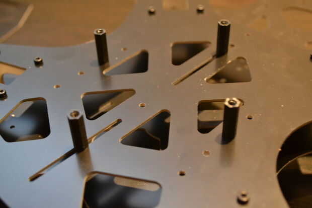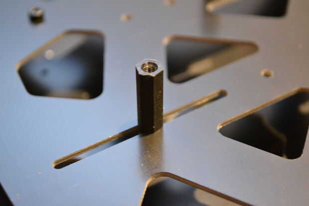Por lo tanto, coloque la placa de montaje para que los botones en la KK2.1 están hacia la parte posterior de la embarcación. Luego, utilizando los cuatro tornillos de nylon negro, coloque la placa de montaje para el quadcopter. Conseguir los tornillos ajustados, pero no los apriete demasiado, después de todo son solo plástico.